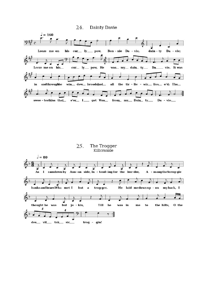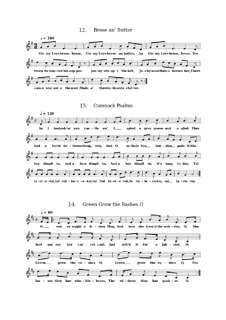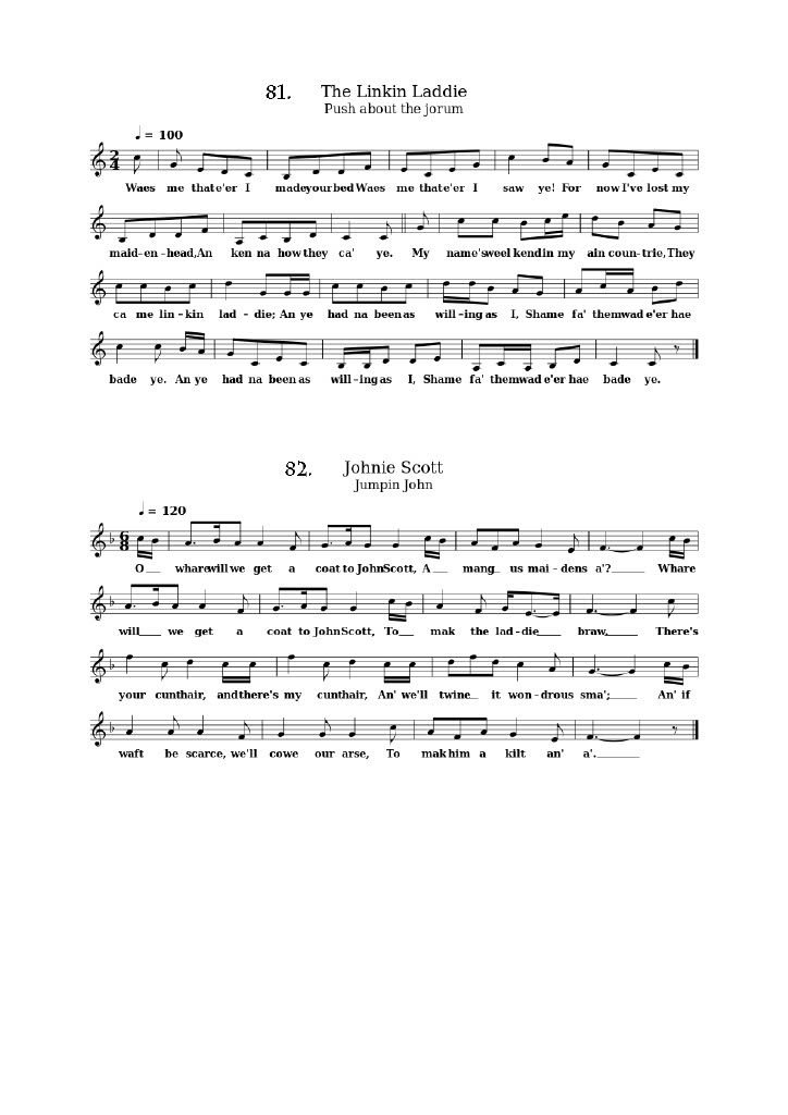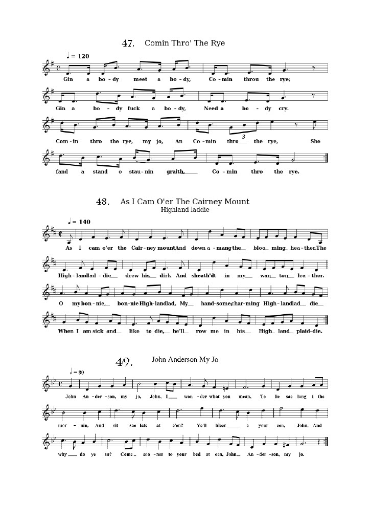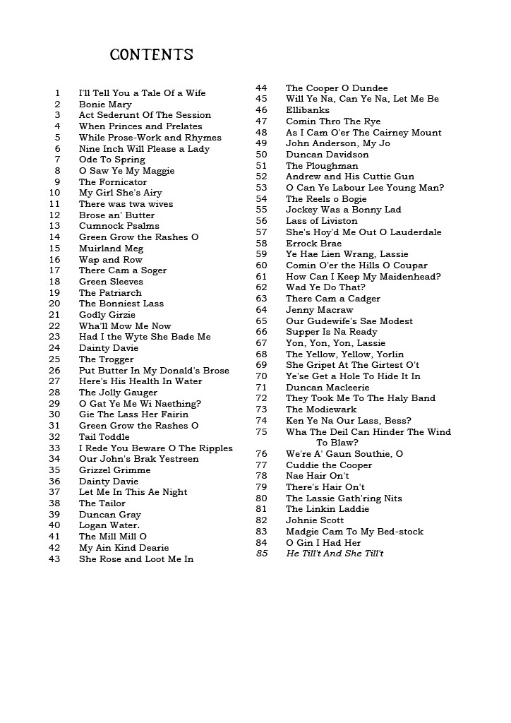 Apart from being a poet in his own right, Burns was also an avid collector of both lyrics and melodies of traditional songs. Many deal with matters of the flesh. I transcribed, for my own amusement, 85 tunes for most of the lyrics contained in the work generally referred to, although not by Burns himself, as ‘The Merry Muses Of Caledonia’ [hereafter ‘M.M.C.’], a work ascribed in varying amounts - depending on the editor - to Robert Burns. I arranged these 85 melodies with introduction, indices etc to print on A4 sheets which, when folded in half, can be stapled or sewn together as an A5 booklet. It is anaide-mémoire rather than a typographical gem.