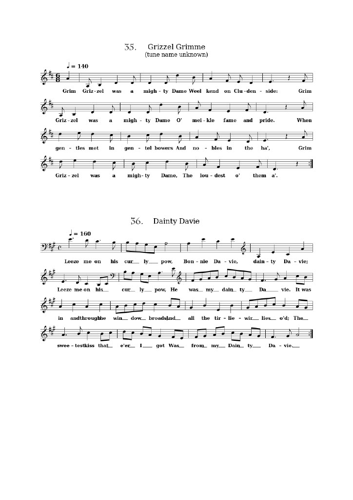The poems and tunes follow the sequence in which they appear in ‘M.M.C.’ edited by James Barke and Sydney Goodsir Smith, [W. H. Allen, London, 1965]. While I have used the text from the Barke/Smith edition, James Kinsley (‘Poems and Songs of R.B.’ Clarendon, 1968) is more accurate and usually better, but Kinsley omits many of the songs included in most editions of the M.M.C., including that of Barke/Smith, because they are deemed to contain little or no original Burns. There have been reprints of the Barke/Smith edition including a very poor one from Luath Press so beware! but second-hand copies of the Allen publication are not hard to find.